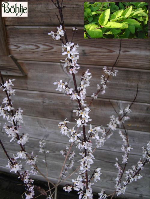 sommergrün, vierkantige Zweige, eiförmige 3 bis 5 cm lange Blättern, Blüten reinweiß, mit rosa Tönung, nach Mandeln duftend, sehr früh blühend, März bis April, vor dem Blattaustrieb, warmer Standort.