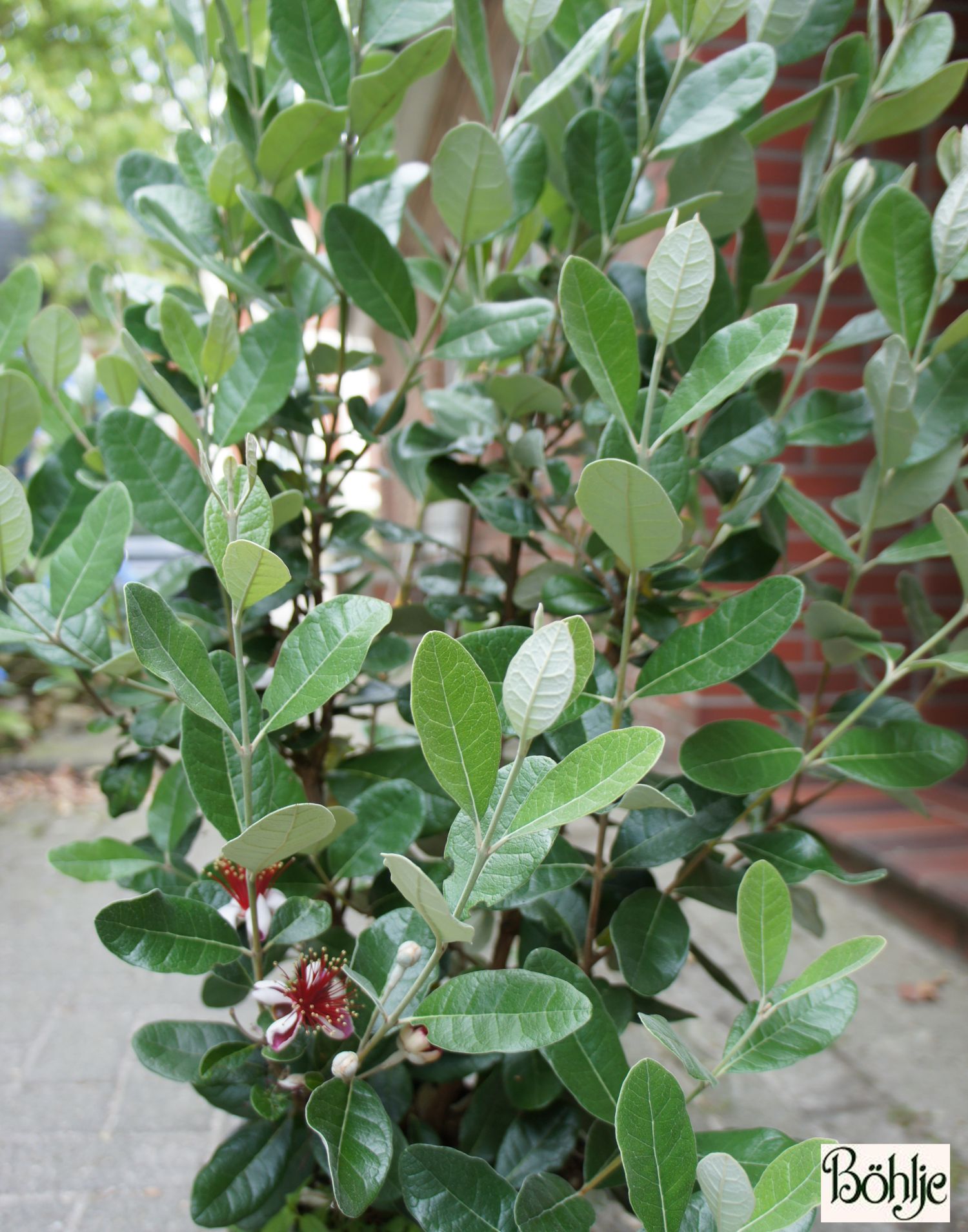 immergrüner, langsam wachsender Strauch, bis 6 m, gräullich bis braune, abblätternde Borke, dunkelgrüne, elliptisch lanzettliche, 6 cm lange Blätter, Unterseite weißfilzig, weiße, bis purpurrötlichfarbene Blüten, zahlreiche rote Staubblätter, kleine, grüngelblich, eiförmige Früchte.