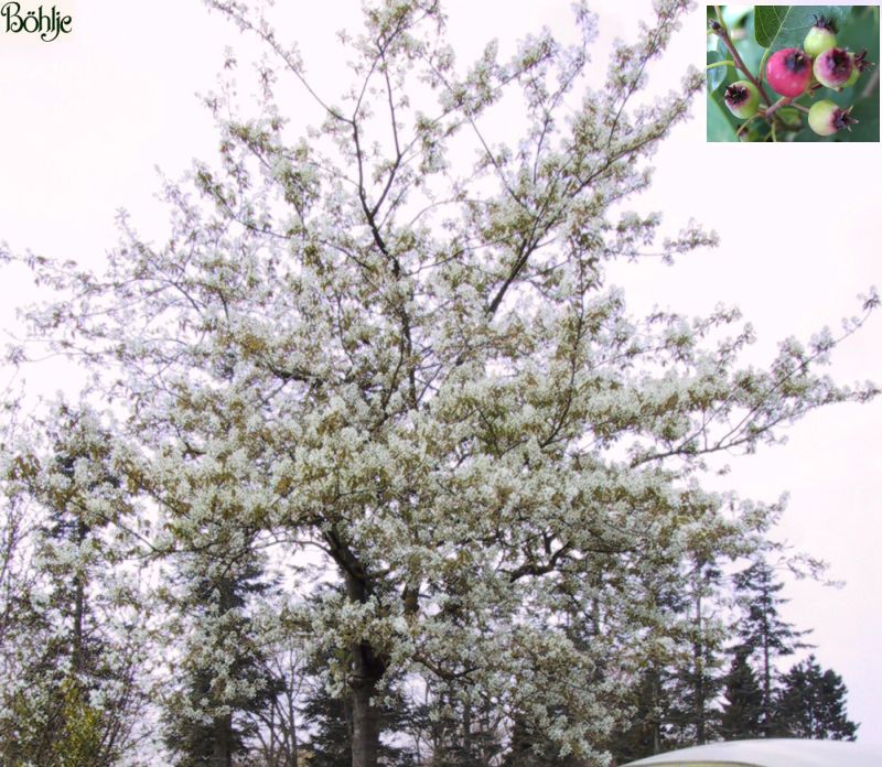 weiße Blüten, starke Grundtriebe, dicht verzweigt, aufrecht, Zweige leicht überhängend, leuchtend orangerote Herbstfärbung, blauschwarze Früchte, essbar.