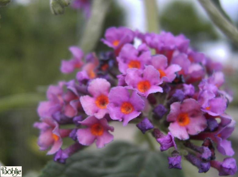 mittelhoher Strauch,Wuchs stark aufrecht, Blüten in länglichen Rispen, violettblau, orange Mitte, duftend, von Juli bis Oktober.