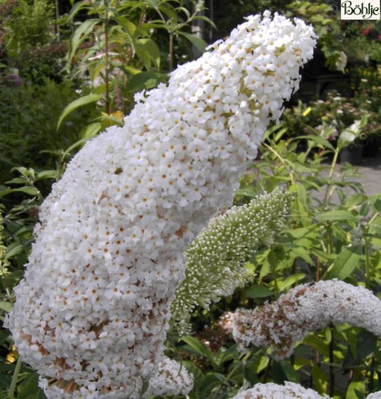 mittelhoher Strauch,Wuchs stark aufrecht, Blüten in länglichen Rispen, weiß, duftend, von Juli bis Oktober.