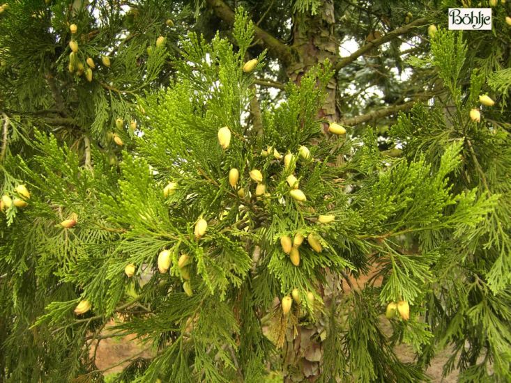 hoher, aufrecht wachsender Baum, schlanker als die Art, tiefgrüne, glänzende, schuppenförmige, ledrige Benadelung.