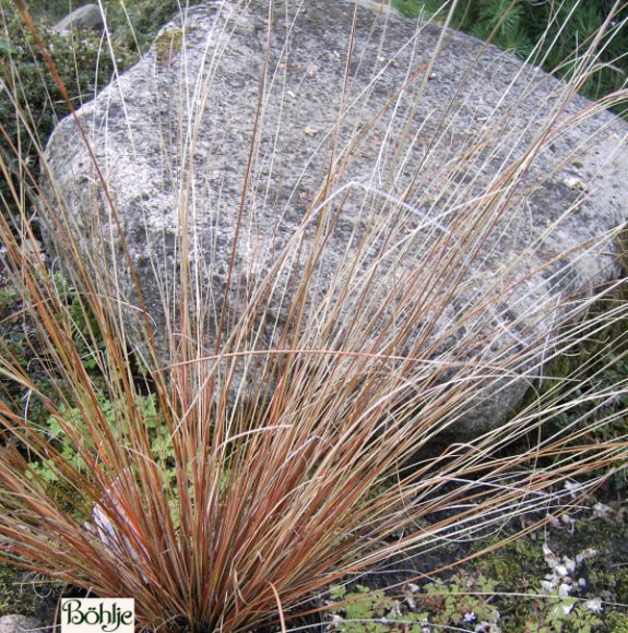 horstartig wachsendes Gras, aufrecht bis bogig überhängender Habitus, 30 bis 50 cm, schmale Blätter, ganzjährig rötlichbraun, unscheinbare Blütenähren, Juli,