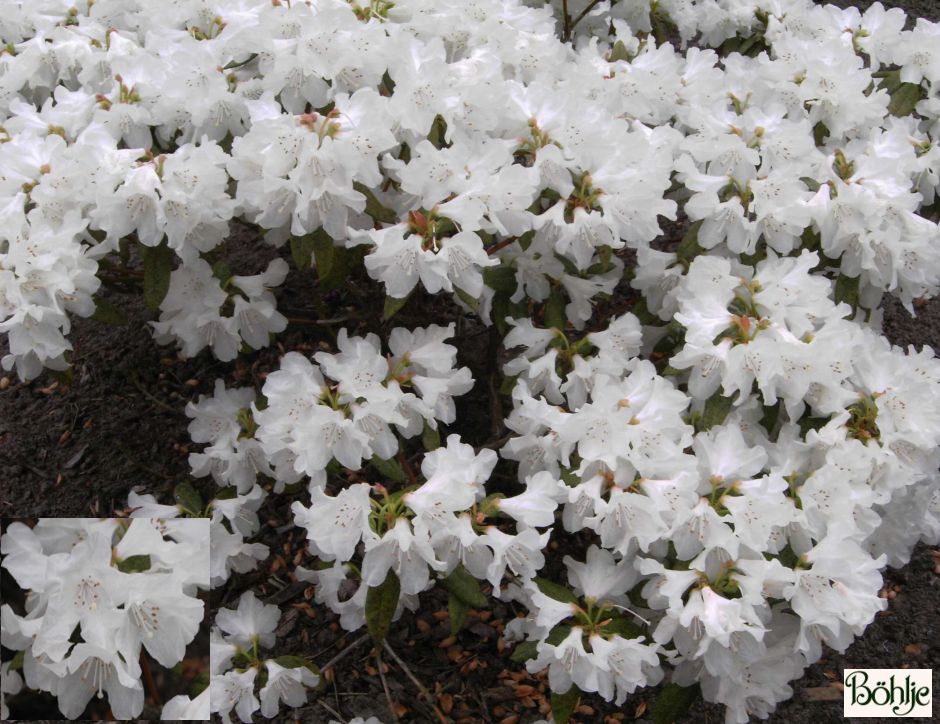 Blüte weiß, Anfang bis Mitte Mai, Wuchs breit, niedrig, kompakt, bis 90 cm hoch, Laub dunkelgrün