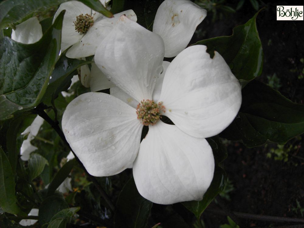 aufrechter, wüchsiger Hartriegel mit auffallenden großen Hochblättern, Mai bis Juni, cremeweiß, Durchmesser der gesamten Blüte über 10 cm.