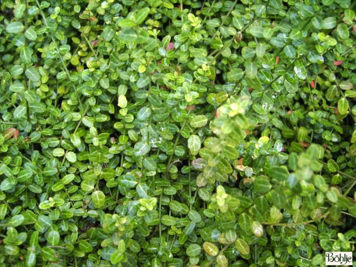 bodenaufliegende, immergrüne Zwergform, ovale, dunkelgrüne kleine Blätter, sehr zierlich.