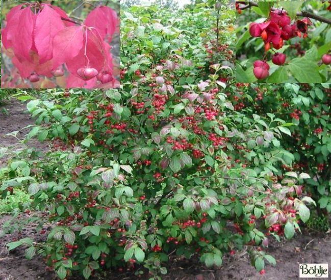 aufrecht wachsend, auffällige, große, spitz zulaufende, rote Winterknospen, Samenmantel auffällig groß, dunkelrot, ab September, Herbstfärbung früh,Früchte 2 cm groß, giftig.