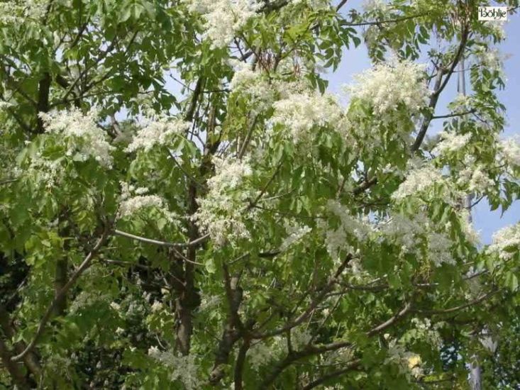 mittelgroßer Baum, breit, runder Wuchs, 8 bis 10 m hoch, sommergrün, unpaarig gefiedert, 15 bis 20 cm lange Blätter, sehr schöne gelb bis hellbraune Herbstfärbung, Blüte cremeweiß, in dichten 15 cm langen Rispen, reichblühend, schöner Duft, von Mai bis Juni.