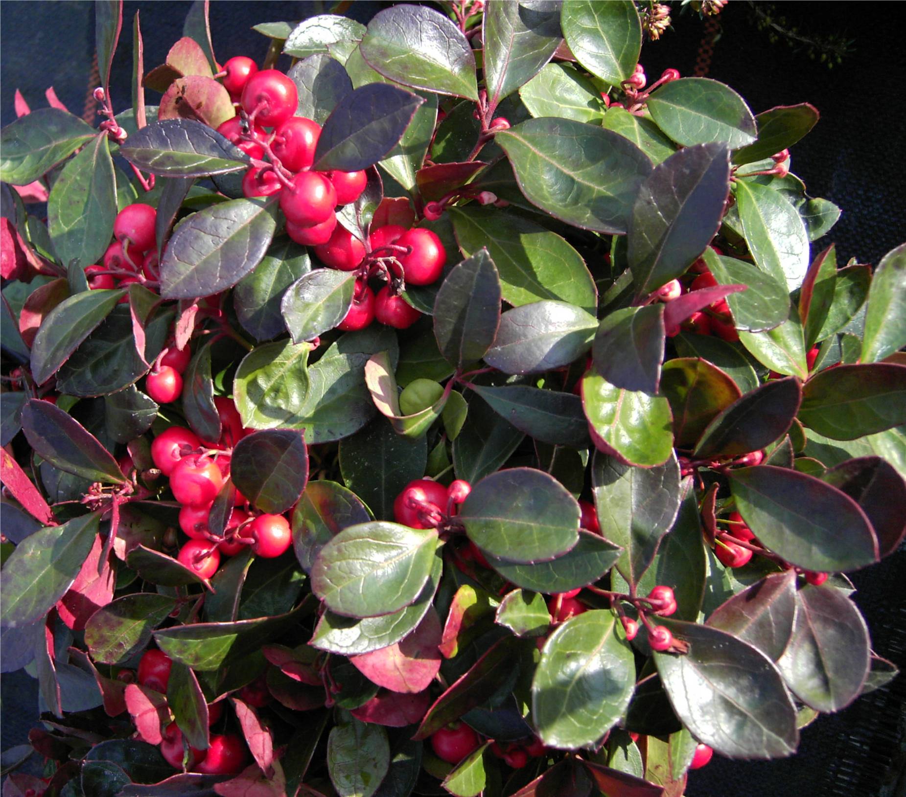 teppichbildender, bis 15 cm hoher Strauch, Blätter eiförmig, kurz gestielt, glänzend dunkelgrün, Blüte hellrosa, in Trauben, Juli bis August, rote Beeren, bis zum Frühjahr haftend, guter Bodendecker.