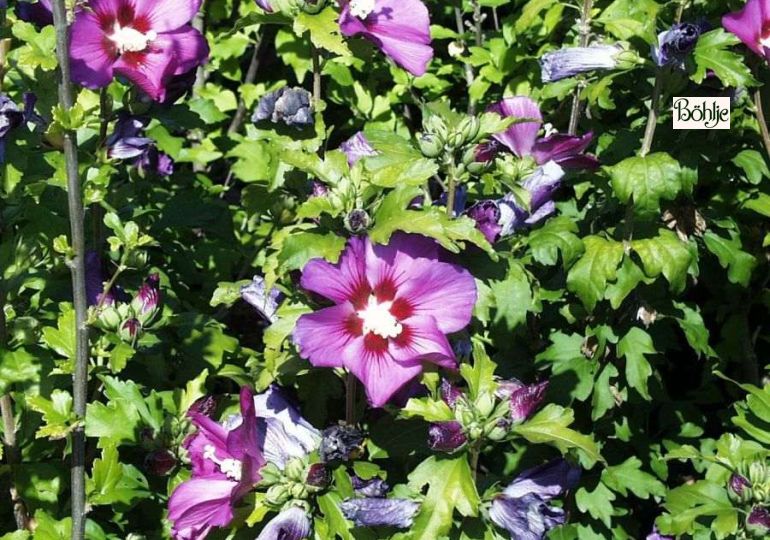 sommergrüner, straff aufrechter Strauch, dreilappige, tiefgrüne Belaubung, Blüten violett, einzelnd in den Blattachseln stehend, malvenartig, von August bis September.