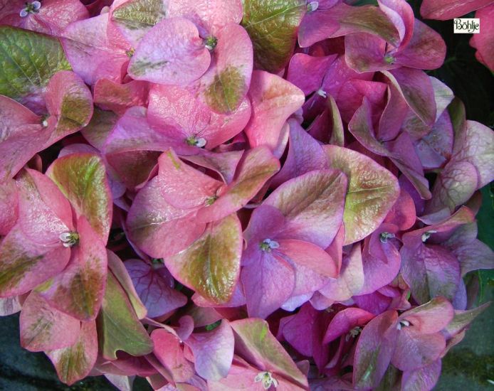 sommergrüner, breitaufrechter Strauch, fleischige, 10-15 cm lange, eiförmige Blätter, Blütenfarbe abhängig vom pH Wert des Bodens, Blüte rotgrün.