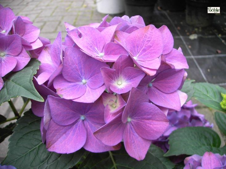 sommergrüner, breitaufrechter Strauch, fleischige, 10-15 cm lange, eiförmige Blätter, Blütenfarbe abhängig vom pH Wert des Bodens, Blüte ballförmig, violettrot.