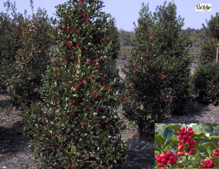 immergrün, schwächerer Wuchs als die Art, Blätter stark dornig, gezähnt, Blüte weiß, Früchte scharlachrot, schnittverträglich.