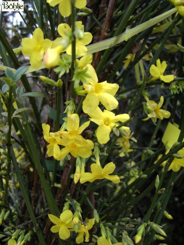primelgelbe, forsythienähnliche Blüten, Dezember bis April, mit langen rutenförmigen, bogig überhängenden Trieben, Kletterhilfe nötig.