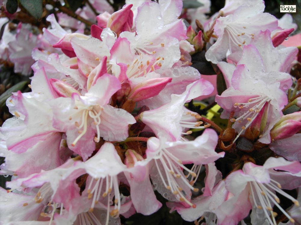 Blüte hellrosacreme, Mitte April, Wuchs flach, kompakt, Blätter grün, im Winter rotbraun verfärbt, reichblühend.