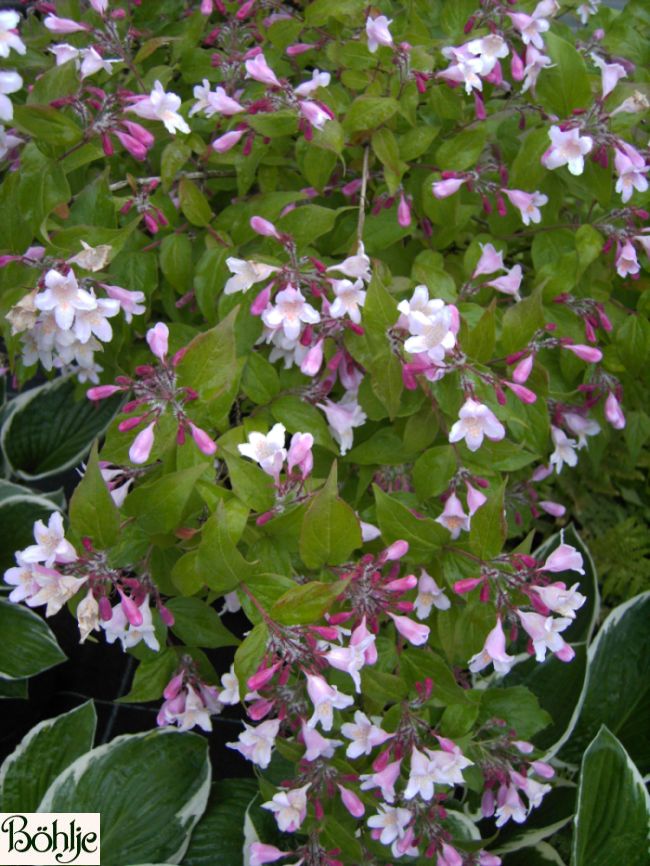 sommergrüner, buschiger Strauch mit überhängenden Zweigen, Blüte rosaweiß, Mai bis Juni.