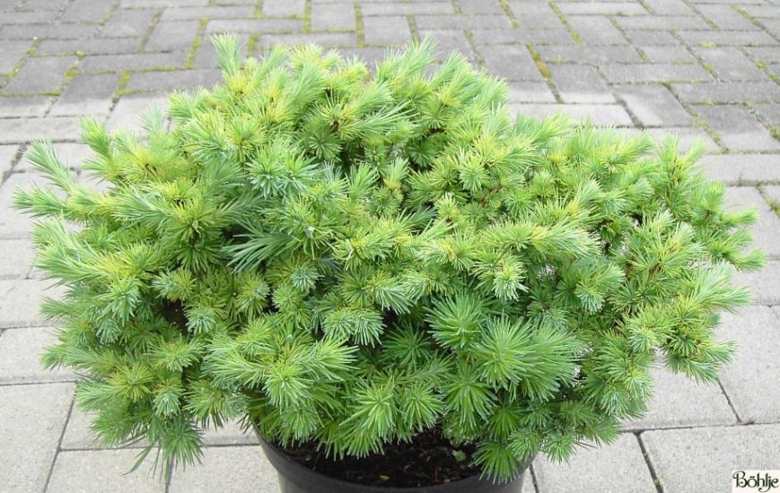 Zwergform, mehr breit als hoch, gedrungene Triebe, gleichmäßig nach allen Seiten abstehend, Nadeln leicht gedreht, blaugrün.