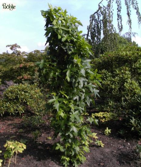 schlankwachsender Baum, 8 bis 10 m, unregelmäßige, dicke Korkrinde, grüne, ahornähnliche Blätter, fünf- bis siebenlappig, rotorangene Herbstfärbung.
