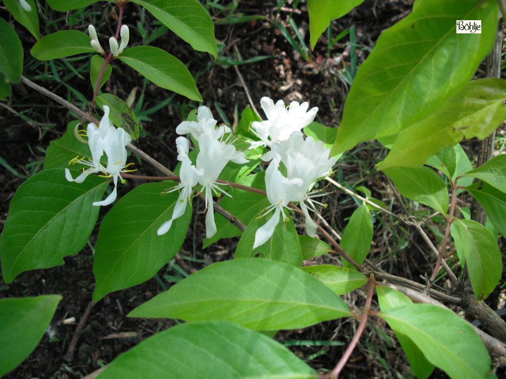 sommergrüner, aufrechter bis 3 m hoher Strauch, Blüte weiß, im Verblühen gelblich, duftend, Mai bis Juni, leuchtendrote, erbsengroße Beeren, Rinde abblätternd, giftig.
