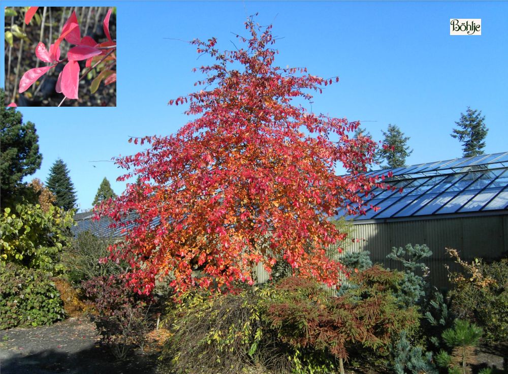 sommergrüner Baum, schlank aufrecht, bis 15 m hoch, schöne orange, gelbe bis feuerrote Herbstfärbung, auch geeignet für extrem feuchte Standorte.