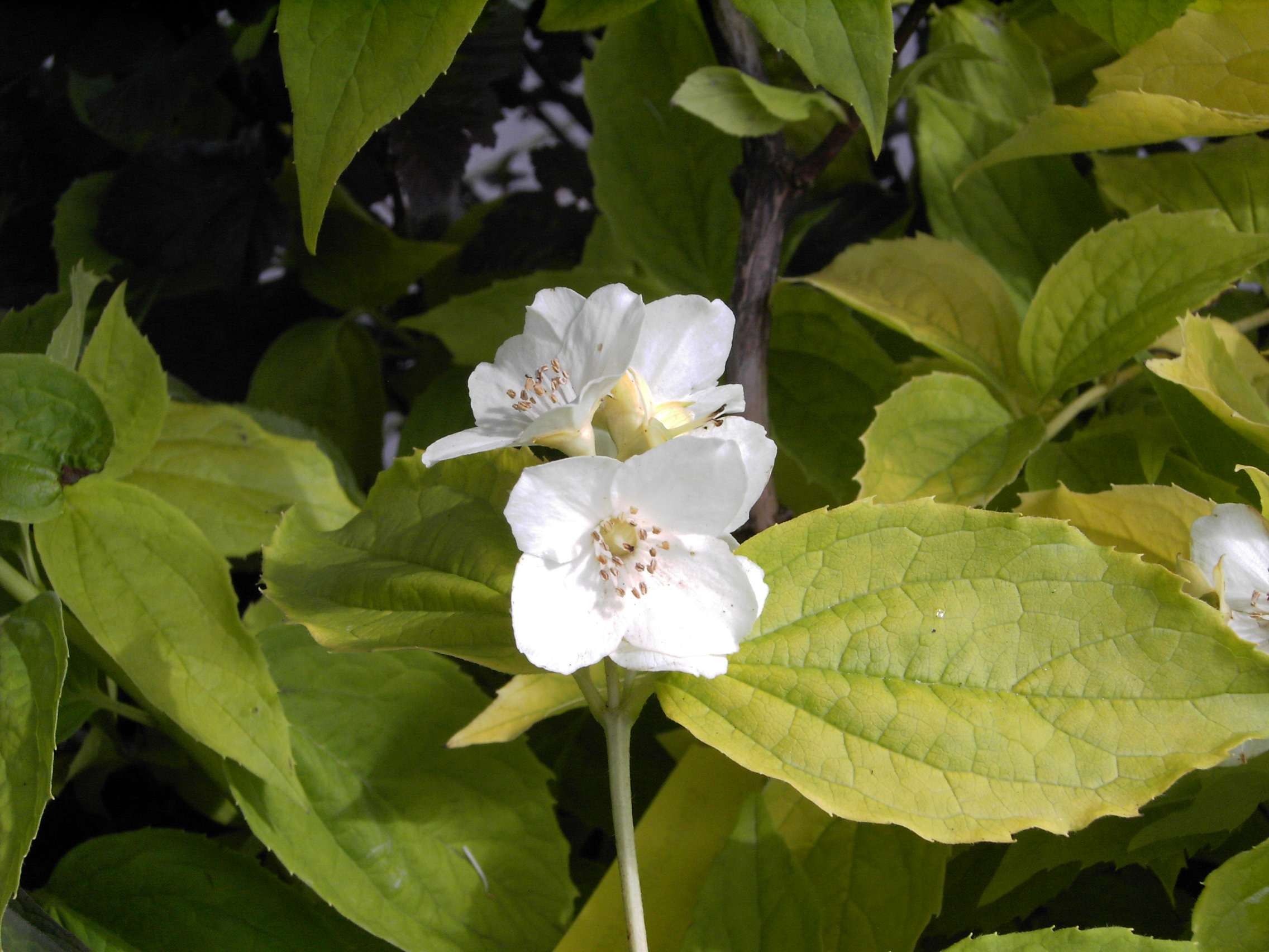 kompakter, schwachwüchsiger, Strauch, bis 1,5 m hoch werdend, Laub hellgelb, Blüte weiß, duftend, Juni.