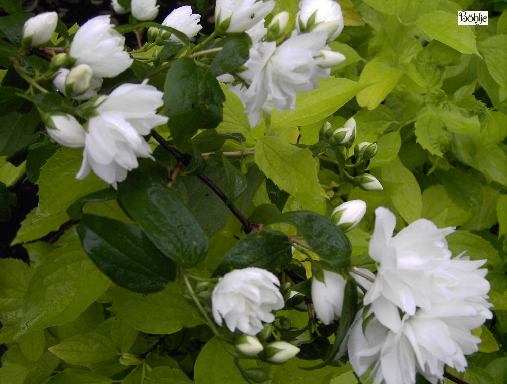 sommergrün, mittelhoch bis 3 m, straff aufrecht, rasch wachsend, Seitentriebe leicht überhängend, Blüte weiß, dicht gefüllt, Juni bis Juli.