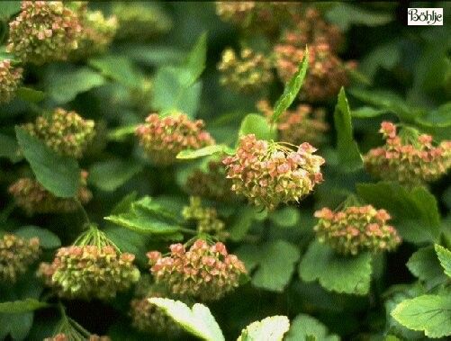 stark wachsender, aufrechter Strauch, Zweige später bogig überhängend, grünes, drei- bis fünflappiges Laub, gelborange Herbstfärbung, Blüte in weißen Dolden, Juni, Früchte blasig aufgetrieben.