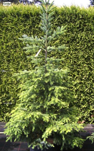 kegelförmiger Wuchs, bis 35 m hoch, Triebe waagerecht, Triebspitzen leicht ansteigend, Nadeln dunkelgrün, Unterseite blauweiß.