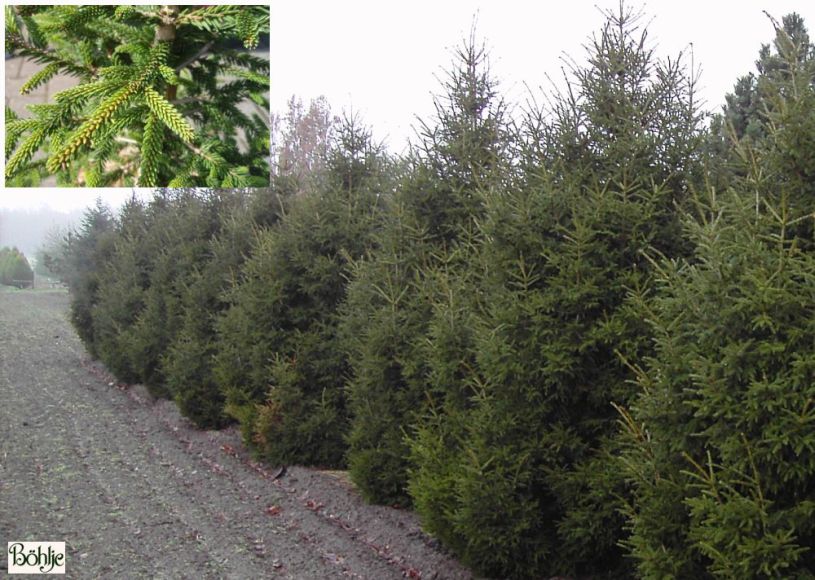 zierliche, feine, schwachwachsende Form der morgenländischen Fichte, dicht geschlossene Kegelform, Nadeln sehr kurz, straff anliegend.
