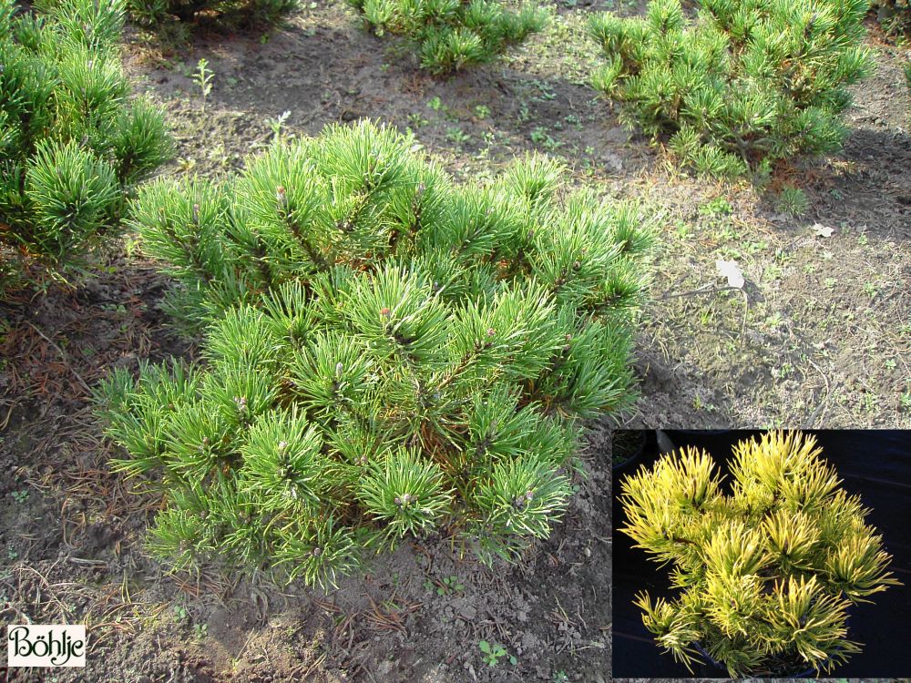 breitbuschig und kompakt im Wuchs, Äste dichtverzweigt, Zweige aufgerichtet, auffällige leuchtend gelbe Winterfärbung, gedrehte Nadeln.
