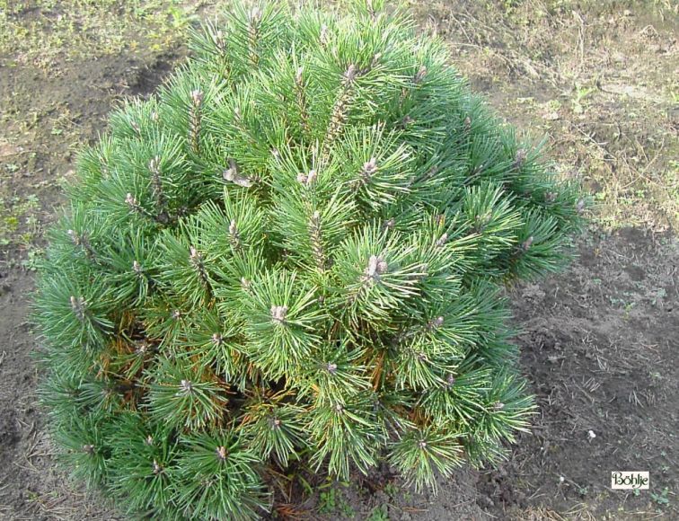 kugelige, später breit kissenförmige Zwergform, bis 1 m, mit kurzer, dichter Verzweigung, sehr langsam wachsend, kurze dunkelgrüne Benadelung.