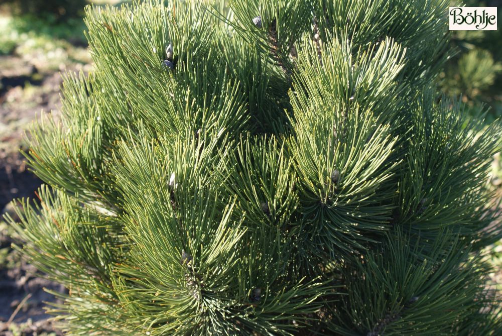 kompakt wachsende Form der Tränenkiefer, Benadelung kürzer als bei der Art, stahlblau.