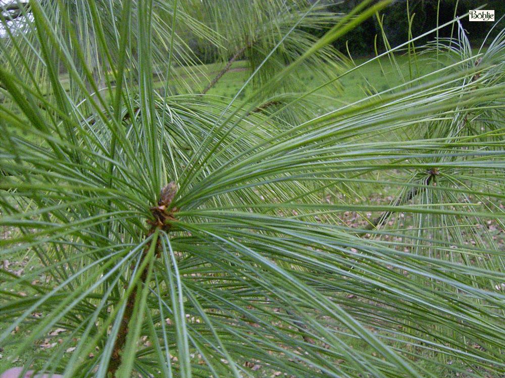 Konifere mit dünnen, bläulichgrünen Nadeln, hängend, Zapfen mit Hartztropfen überzogenk daher "Tränen-Kiefer"