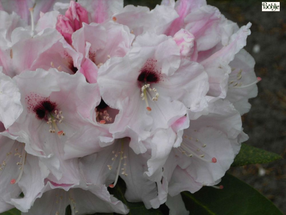 Blüte: innen weißrosa, schwarzroter Fleck, gewellte Blütenblätter