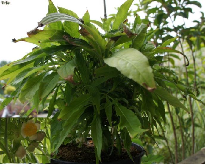 kleiner, sommergrüner Strauch, 50 cm, hellgrüne, lanzettliche Blätter mit fein gezackten Rand, weiße Blüten, Juni bis November,