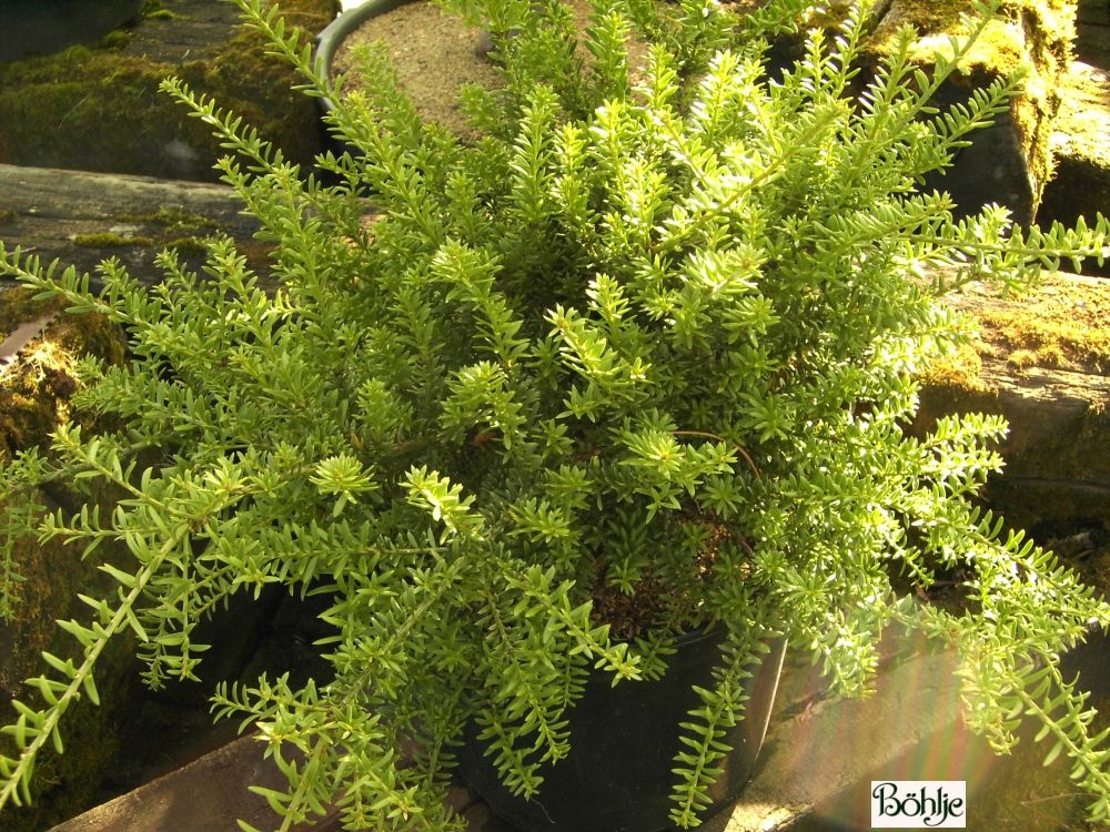 frosthärteste und daher bekannteste und am häufigsten kultivierte Art dieser Gattung, aufrecht bis kriechender Zwergstrauch, bis max. 2 m Höhe, Nadeln rund, dicht und unregelmäßig gestellt, kurz und derbledrig , nicht spitz, Farbe gelblichgrün.