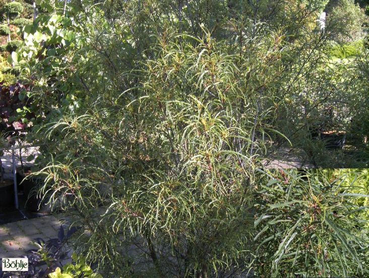 schmale dunkelgrüne Blätter, trichterförmiger Wuchs, bis 3 m hoch, attraktive Herbstfärbung, für kleine Gärten und Pflanzgefäße geeignet.