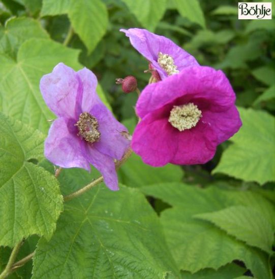 sommergrüner, aufrecht wachsender Strauch, 1,50 bis 2 m, Spitze leicht übergeneigt, rotbraune, borstige Triebe, große, dunkelgrüne, Blätter, 25 cm breit, beidseitig behaart, purpurfarbene, sehr große Einzelblüten, 3 bis 5 cm, Juni bis August, rote, ca. 0,50 cm dicke Früchte, essbar.
