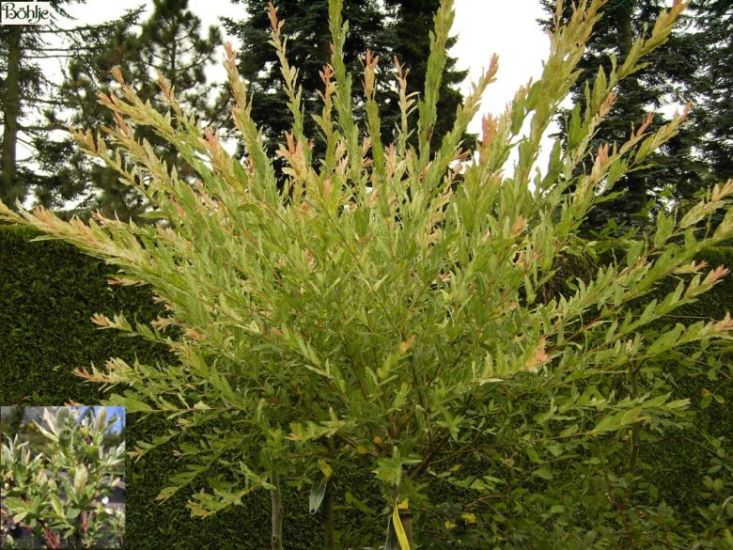 sommergrüner, kleiner Strauch, mit dünnen, rötlichen, bogig überhängenden Trieben, weißbuntes Laub mit leichtem rosa Hauch, starker Rückschnitt im Frühjahr erforderlich.