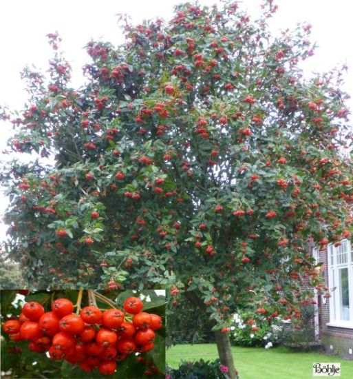 kleiner Baum, 12 m, kegelförmige Krone, straff aufrechte Äste, sommergrüne, wechselständig angeordnete Blätter, glänzend dunkelgrün, im Austrieb und unterseits weißfilzig, gelbliche Herbstfärbung, eiförmige, orangerote Früchte,