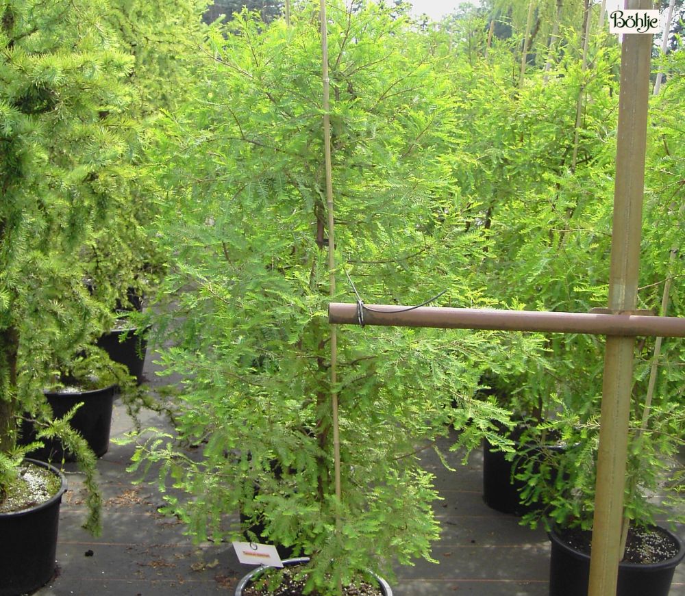 sommergrüne, winterharte Nadelholzart aus Nordamerika, wo sie an Sümpfen und Flußufern steht, kegelförmiger Wuchs und fein gefiederte, frischgrüne Blätter, schöne gelbbraune Herbstfärbung.