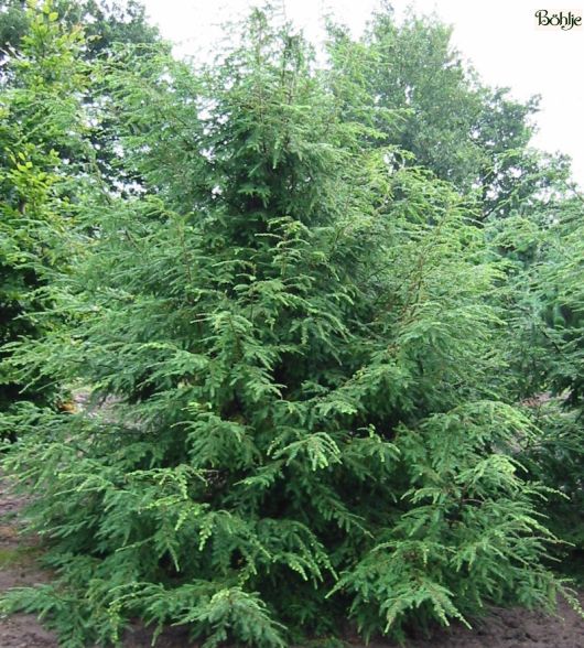 raschwüchsiger, oft vom Grunde an mehrstämmiger Baum mit breit pyramidaler, im Alter offener, lockerer Krone, Zweige leicht überhängend, frischgrün.