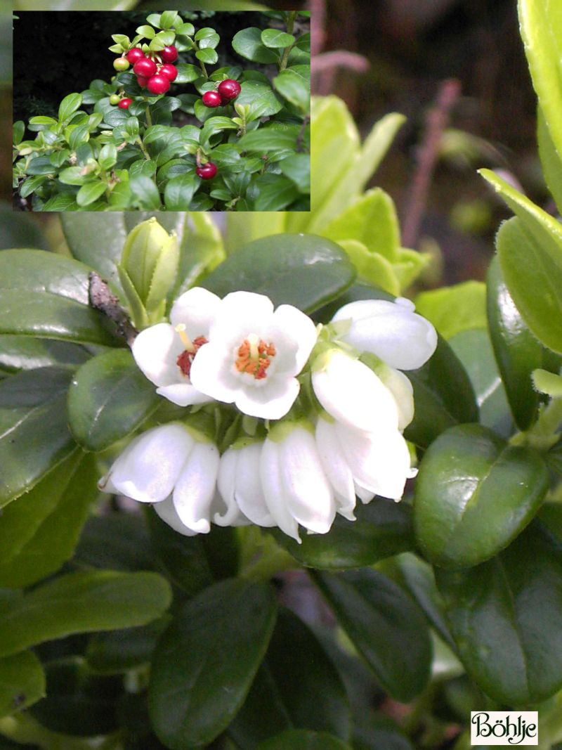 immergrüner, kriechender Strauch, Laub ähnlich Buxus sempervirens var. arborescens, stumpf, eiförmig, glänzend dunkelgrün, Blüte weiß bis rosa im Juni, erbsengroße, rote Früchte, essbar, guter Bodendecker für halbschattige und sonnige Lagen.