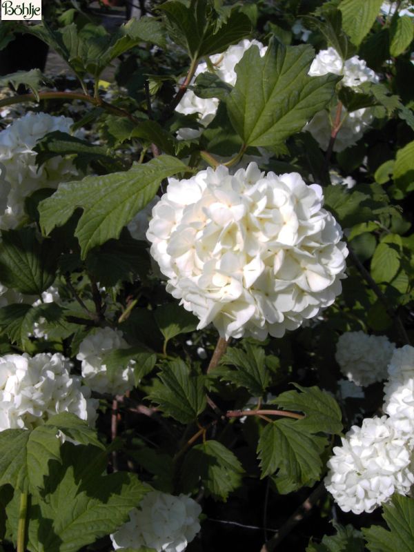 hoher Strauch, Grundtriebe kantig, straff aufrecht, sommergrün, Blätter drei- bis fünflappig, Blüten in dicken, ballartigen, grünen, später weißen Blütenständen.