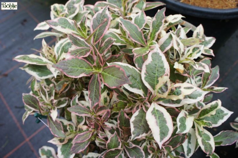 breit, aufrecht, wachsender Strauch, 50 cm, dunkelgrüne Blätter mit weißrosafarbenen Rand, rosafarbene Blüten, April bis Mai, dekorativ, geeignet für Balkonkästen sowie kleine Heckenbepflanzung.