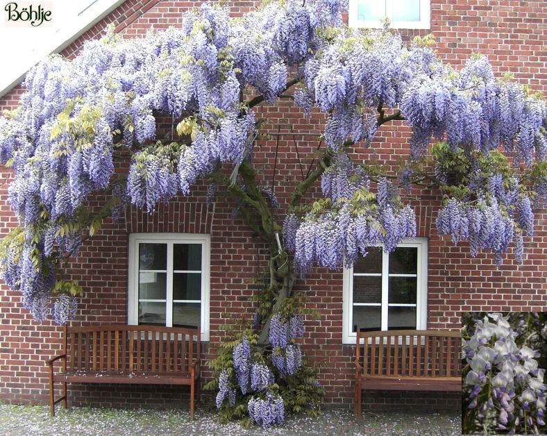 starkwachsender, sommergrüner Schlinger für sonnige bis halbschattige Standorte, besonders wüchsig in nahrhaften, humosen, nicht zu trockenen Böden, durch regelmäßigen Rückschnitt wird die Blütenbildung gefördert, stabiles Rankgerüst erforderlich, Blüte violett, Blütentraube 25 bis 30cm lang groß, Mai bis Juni, nicht an Regenrinnen